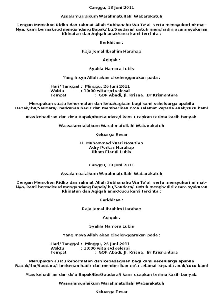Download now 2 cara membuat undangan aqiqah digital di android shalaman. Mau memilikinya silahkan unduh lewat tombol dibawah. Contoh membuat tulisan syukuran khitanan. Contoh ucapan syukuran untuk hajatan aqiqoh syukuran 7 bulanan kalau kita mempunyai hajatan syukuran aqiqah ataupun 7 bulan kehamila. Undangan tahlilan undangan kartu sunat. Nah itulah 91 koleksi contoh undangan syukuran bayi lahir gratis terbaik yang kami posting dengan kata kunci keywords pada kesempatan berbahagia ini, kami berharap, semua gambar diatas bisa membantu anda memenuhi apa yang anda cari. Mulai dari surat undangan syukuran pernikahan, khitanan, puputan, tahlil, ursy dan lainnya. Contoh ucapan syukuran pernikahan dalam nasi kotak contohpedi. Kartu ucapan khitanan biasanya di sertai juga dengan souvenir. Contoh kata sambutan pengantar syukuran khitanan emmet24son. أَعُوْذُ بِاللهِ مِنَ الشَّيْطَانِ الرَّجِيْمِ Biasanya syukuran yasinan ini dilaksanakan di malam hari sebelum akad nikah atau resepsi. Beli tasyakuran khitanan harga murah &